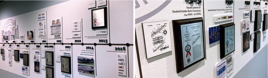 Don’t allow your organization’s story to be left in the past. Compiling your organization’s history with a historical timeline can captivate and inform visitors. This custom historical timeline wall shown below displays decades of company history. Pictograms, plaques and vinyl text are the main items used for telling the company story here.