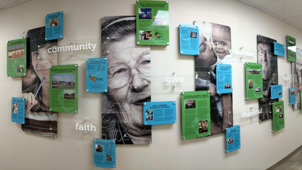 Company values wall for Manna Food Pantries. Fabricated and installed by signgeek.