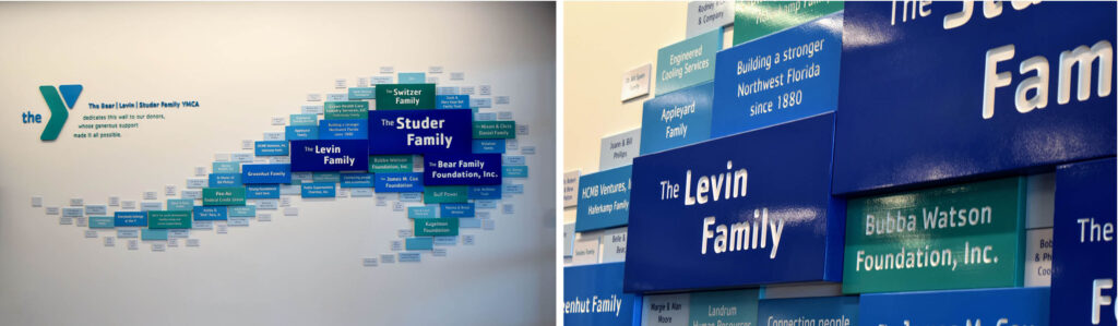Donor recognition wall for YMCA Pensacola. Designed, built and installed by signgeek.