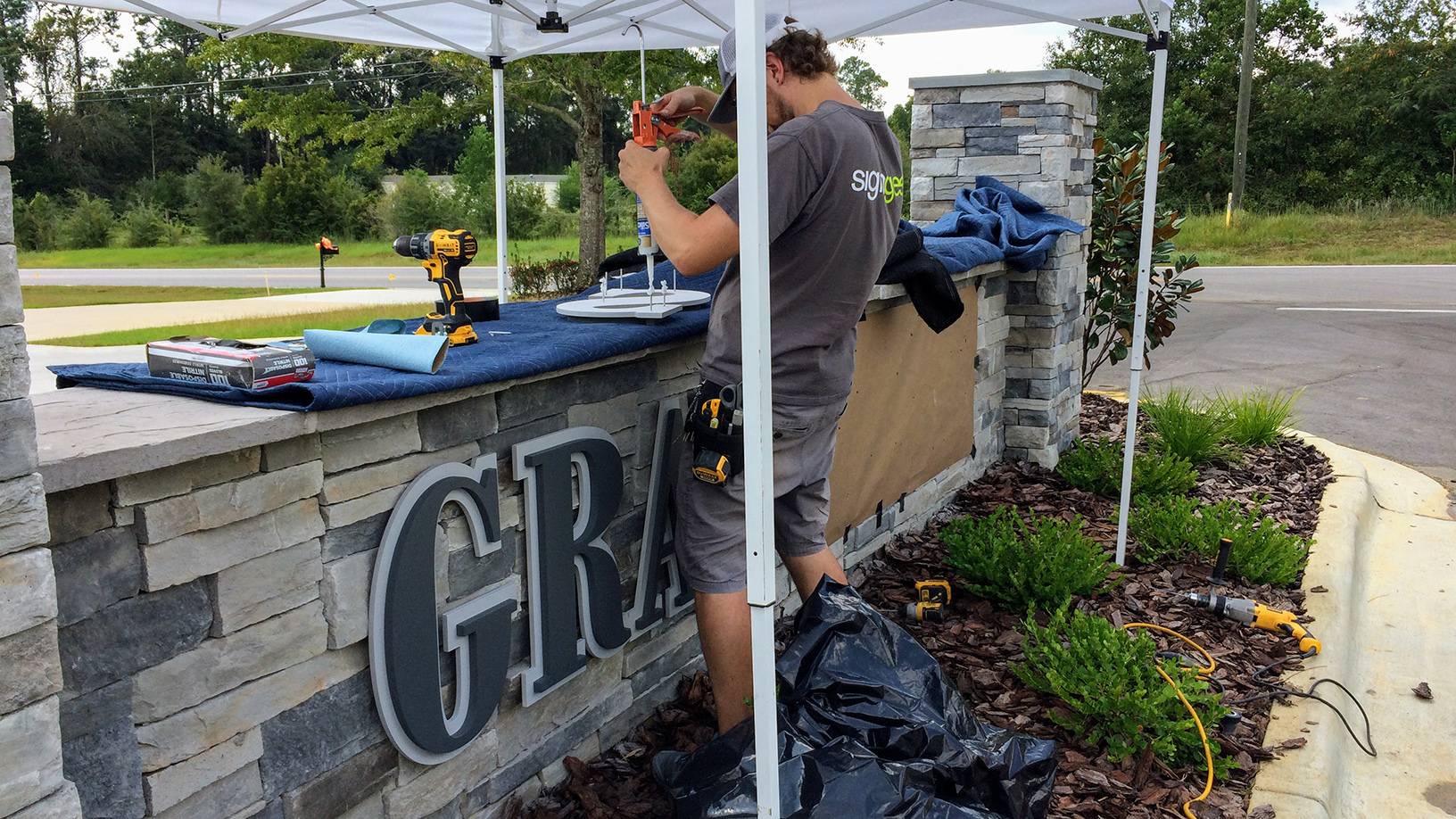 Next, our professional painter smoothly coated both sets of 3D letters in high-quality sign paints. Signgeek has a personal Matthews Paint mixing station on site for consistent, quality work. Our installation tech stud-mounted the dimensional letter sets and faceplates to the stone monument sign on location.