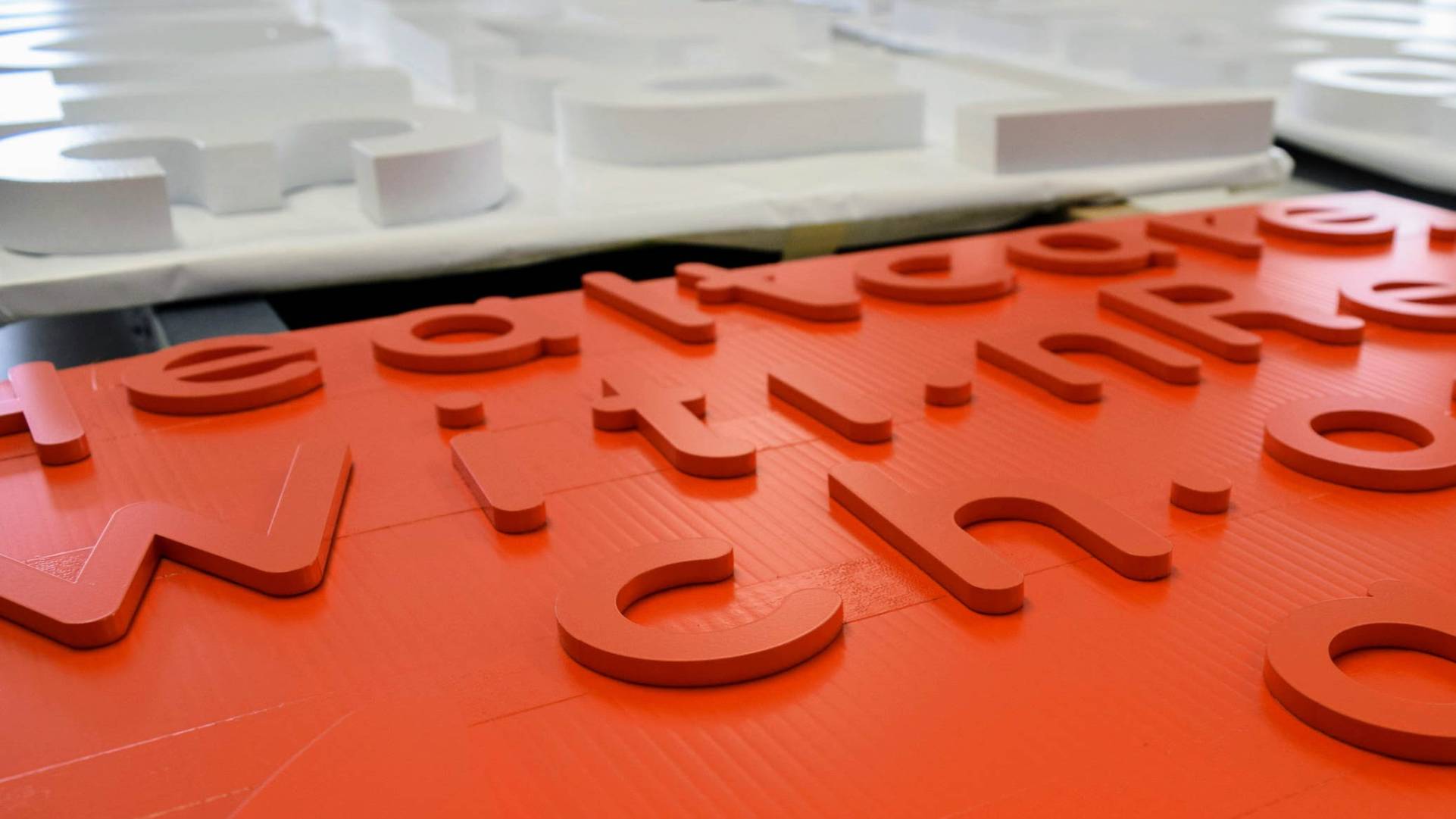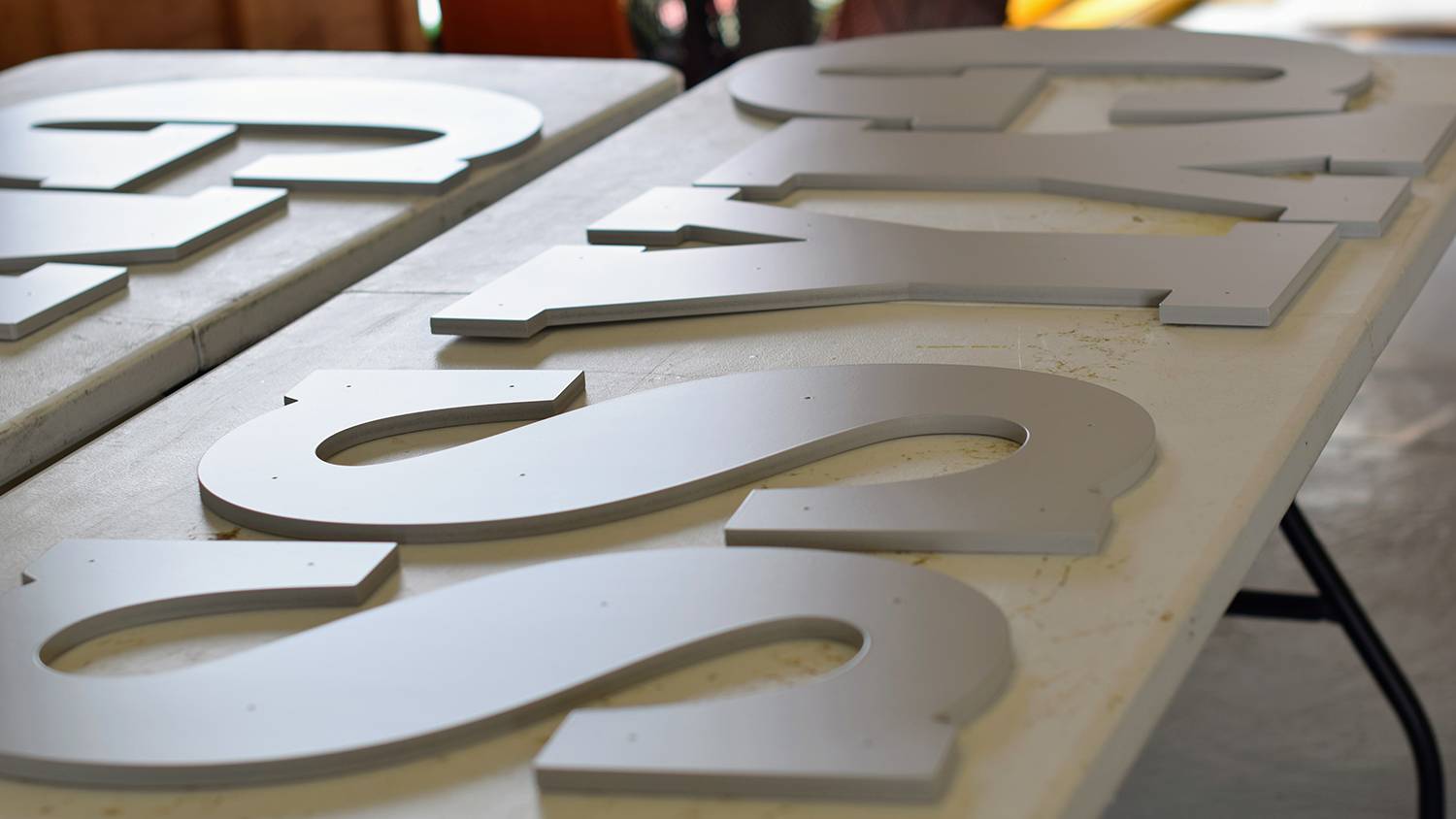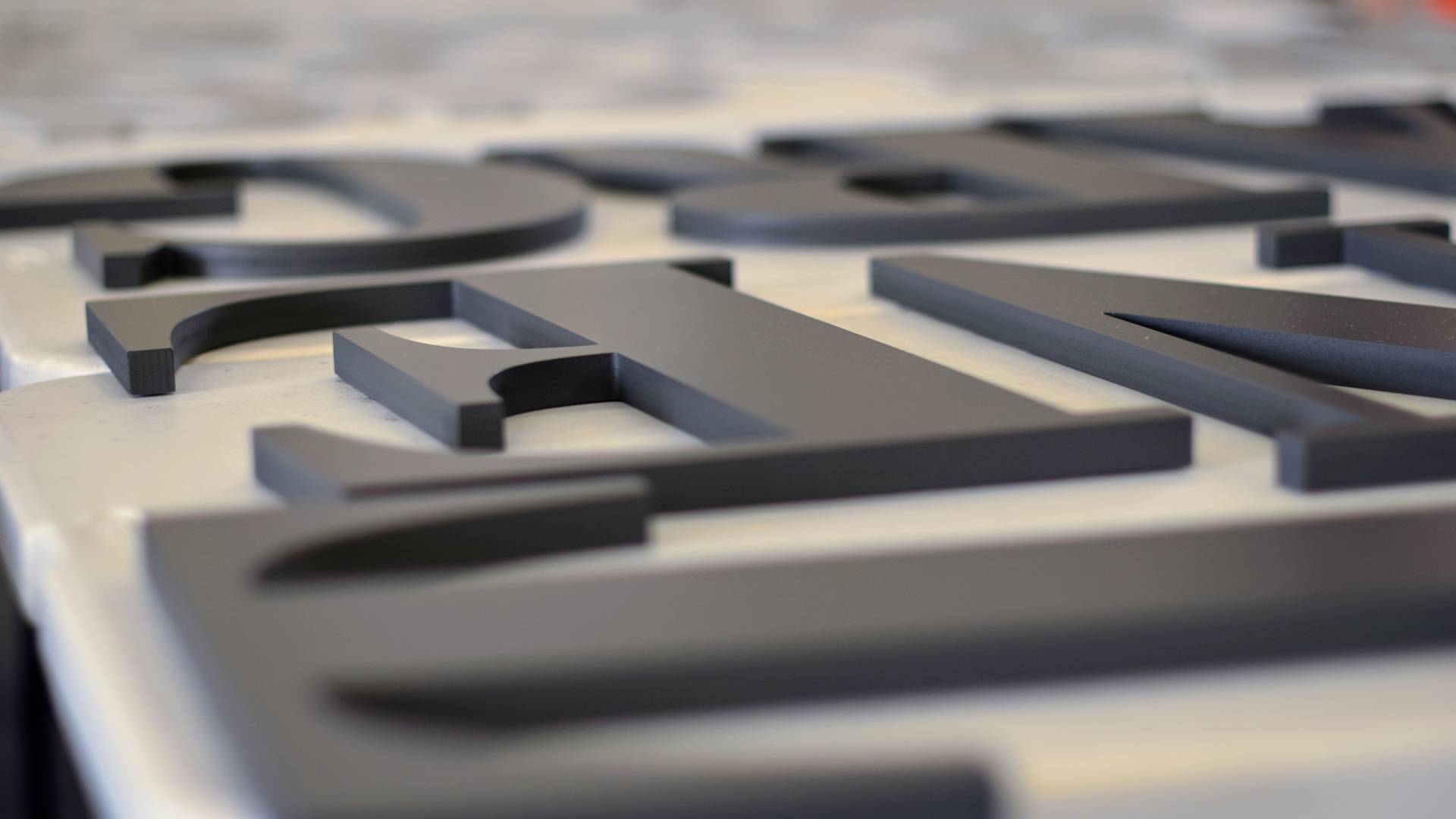 First, our CNC Lead routed the one-and-a-quarter-inch thick letters fabricated alongside thinner half-inch background letters. The lighter grey larger letters shadow the darker gray letterforms placed in the foreground. This method of outlining each letter makes the dimensional verbiage stand out literally and visually to the viewer.