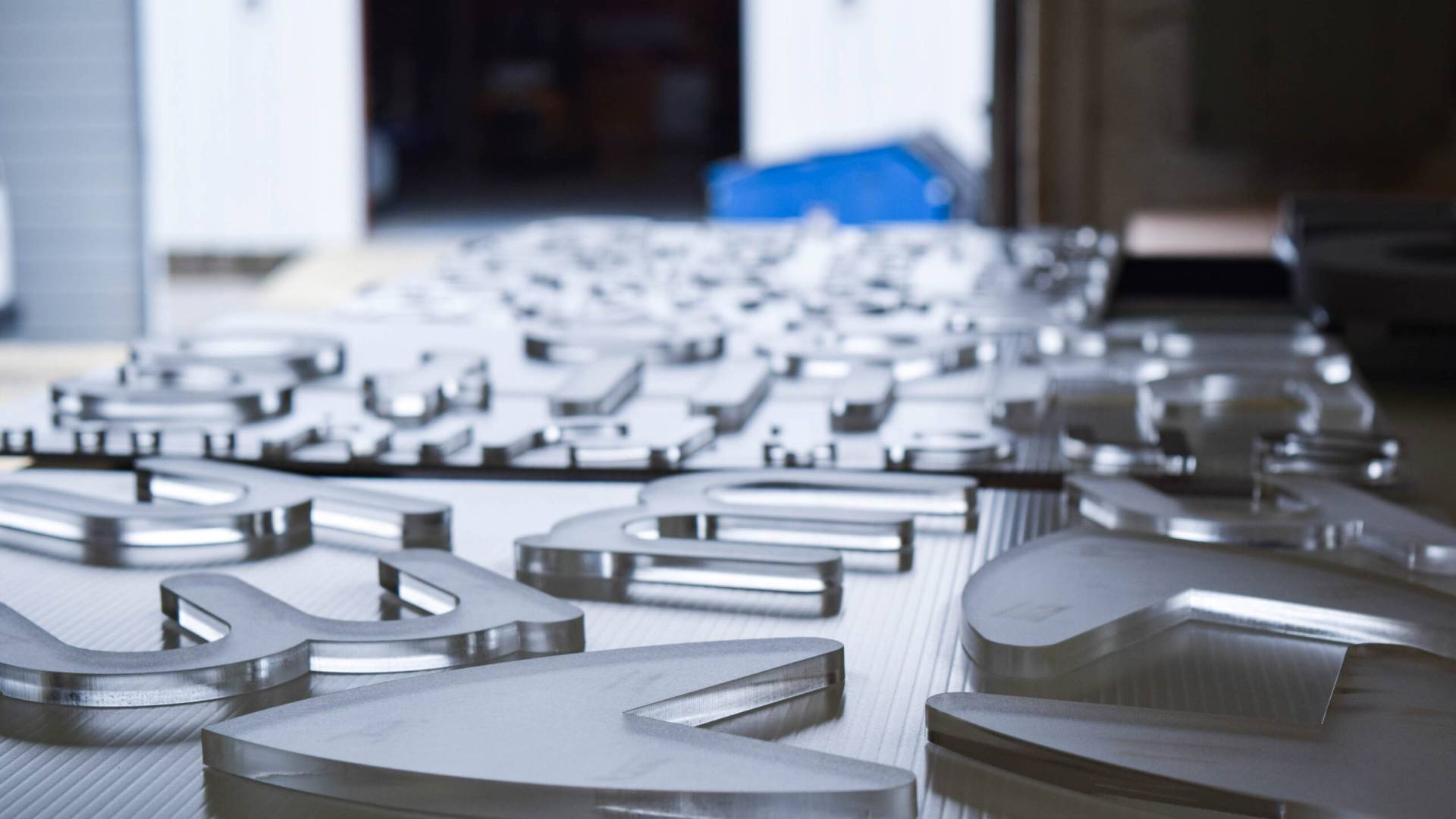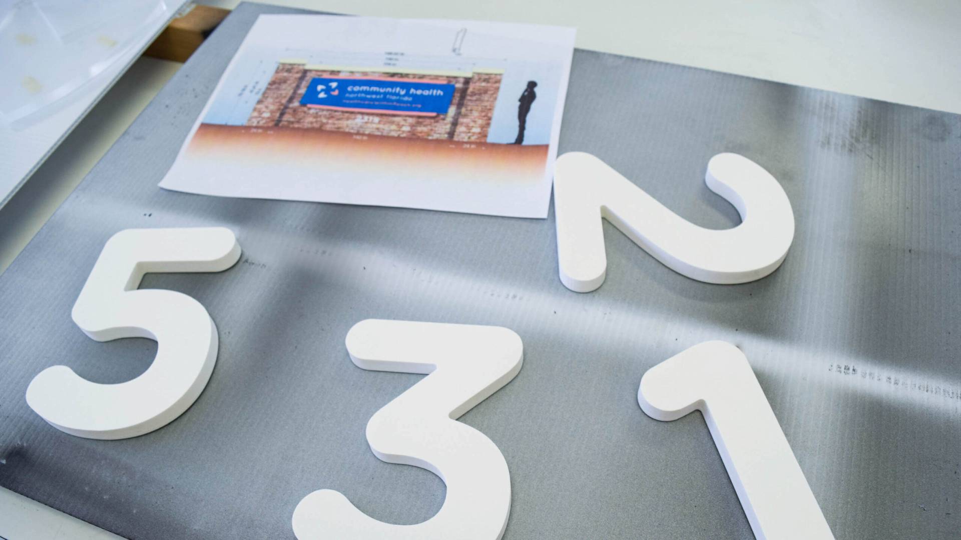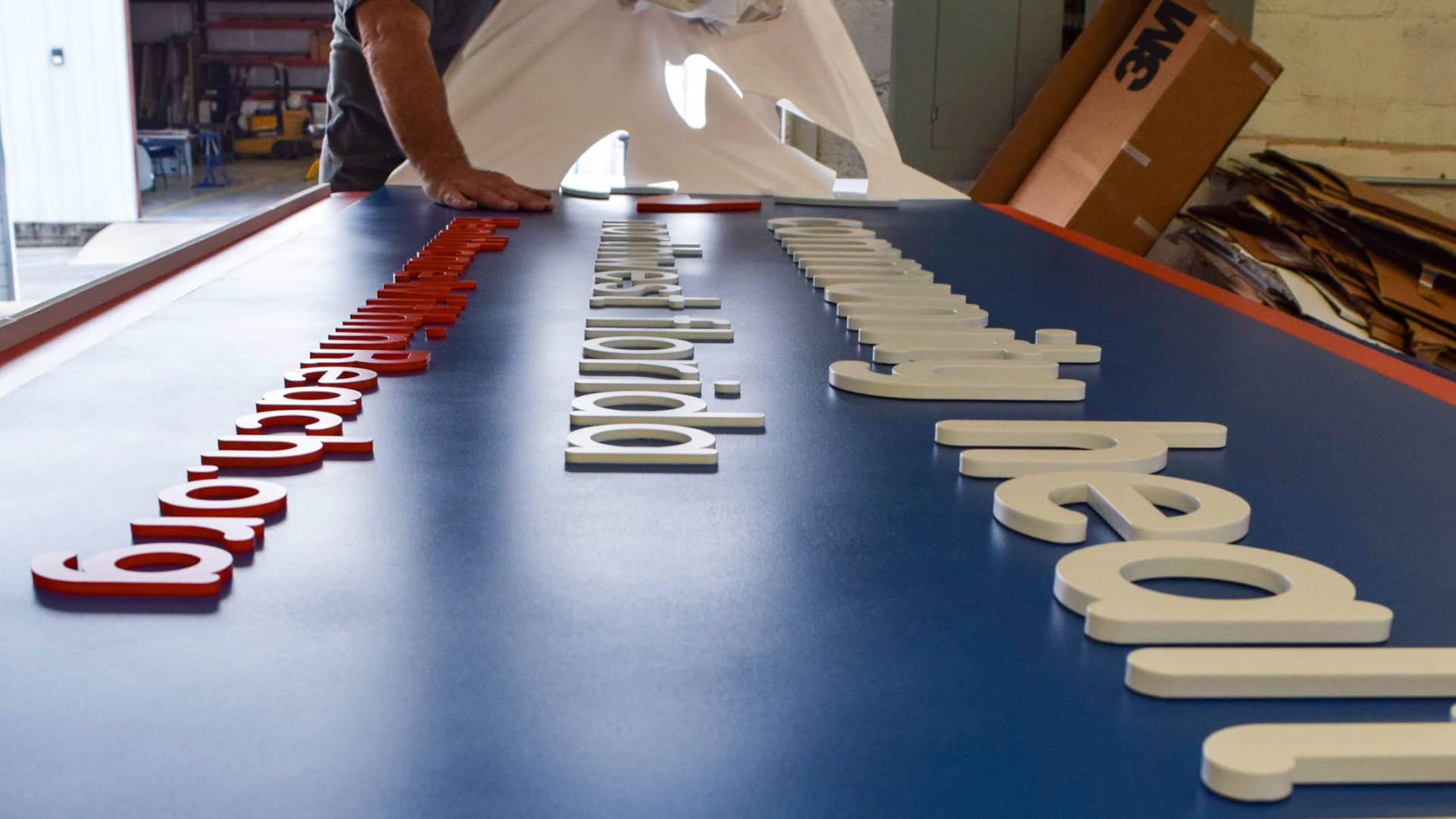 First, our CNC Lead routed the one-and-a-quarter-inch thick letters fabricated alongside thinner half-inch background letters. The lighter grey larger letters shadow the darker gray letterforms placed in the foreground. This method of outlining each letter makes the dimensional verbiage stand out literally and visually to the viewer.