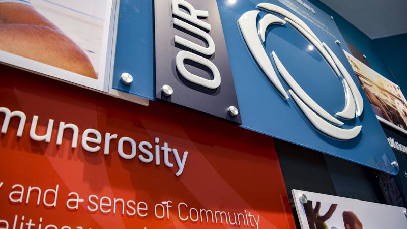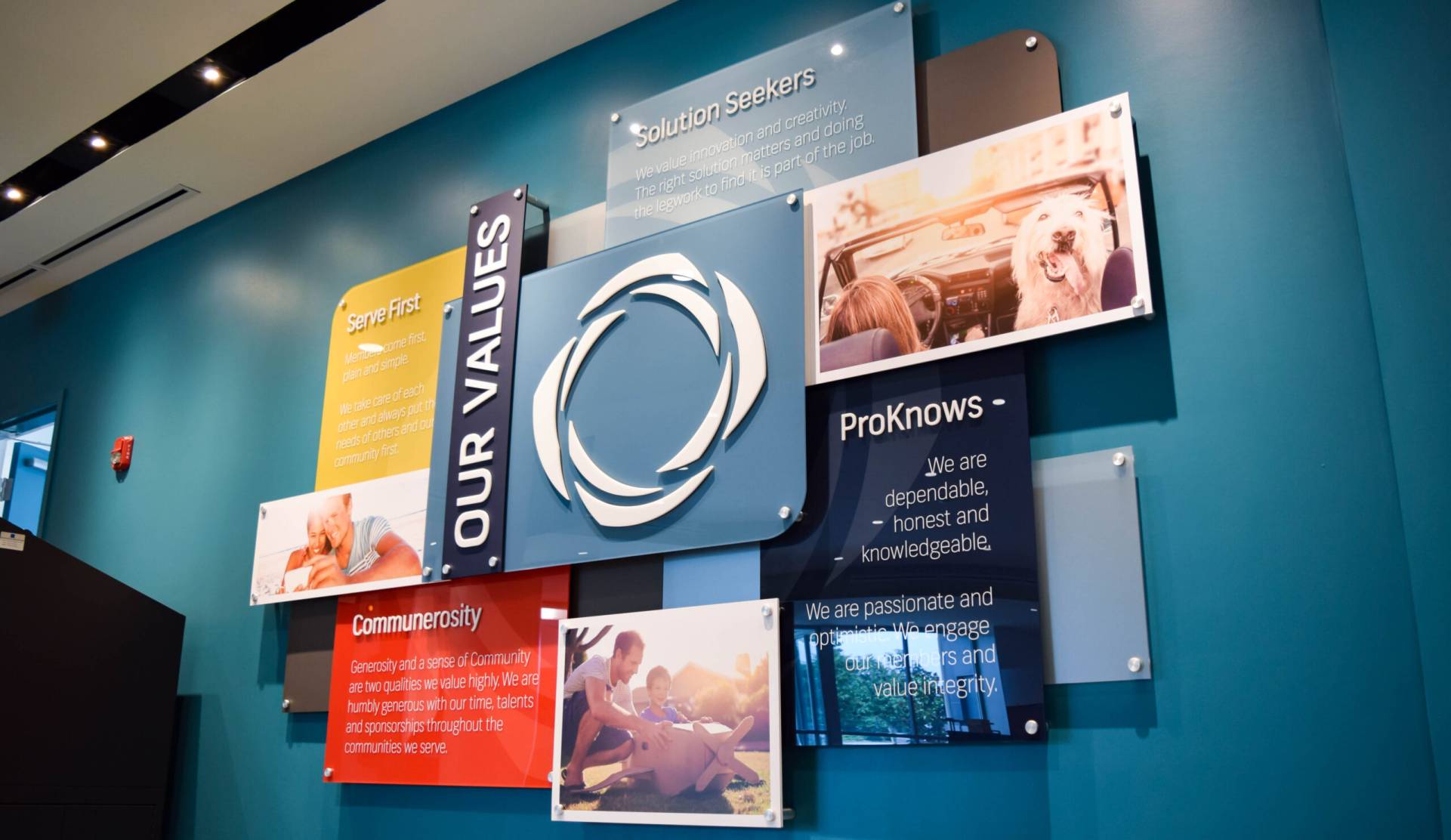 Pen Air Credit Union approached us regarding the design, manufacturing and installment of a multilayer display system that would be the focal point of their new Airport Location. An additional request was having panels they could change once a quarter. They wanted to incorporate their core values along with a customer review and testimonial. We designed an overlapping custom acrylic display with multiple layers. Due to the high amount of wall penetrations involved, we needed to be conscientious in our arrangement and drilling for the initial hardware. Each layer would need to line up perfectly to keep the overall panel alignment correct.