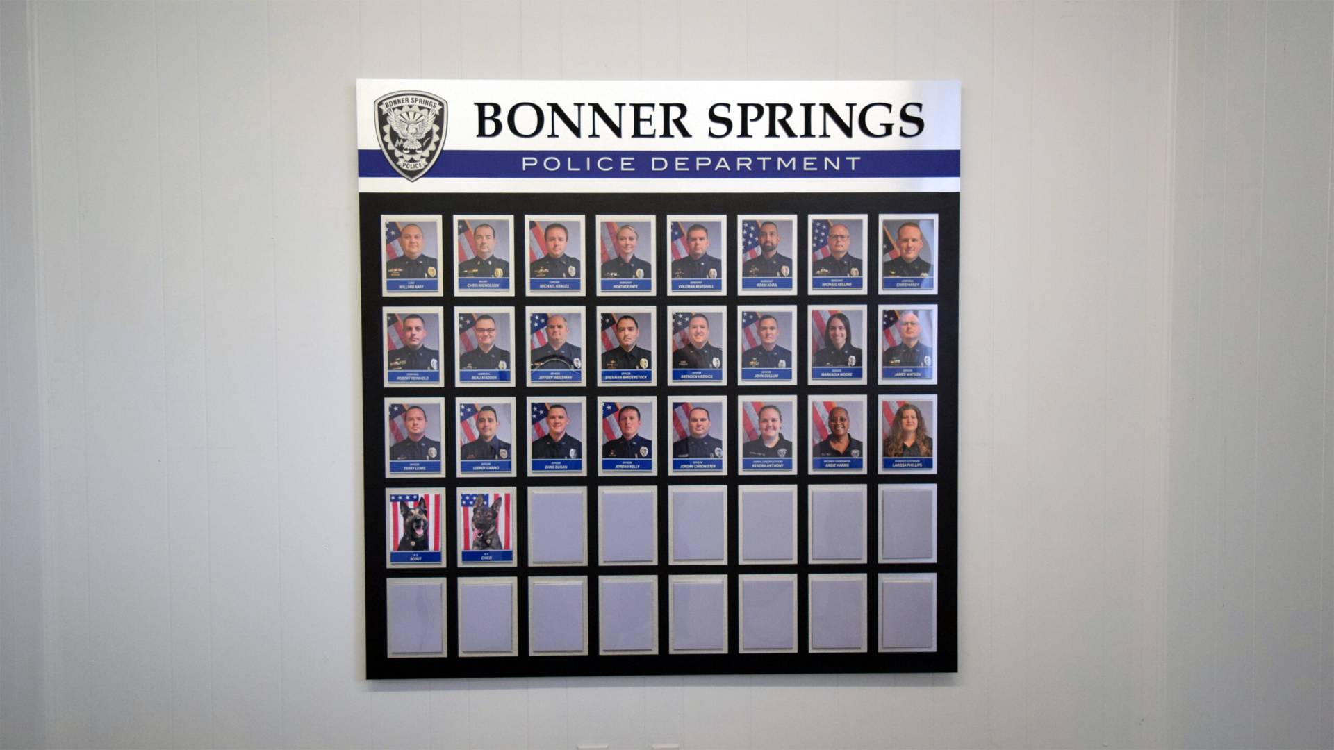 The Bonner Springs Police Department partnered with signgeek to create a custom employee recognition wall honoring their dedicated team members. The department wanted a display that showcased the entire current staff while allowing space for future colleagues as the force grows.