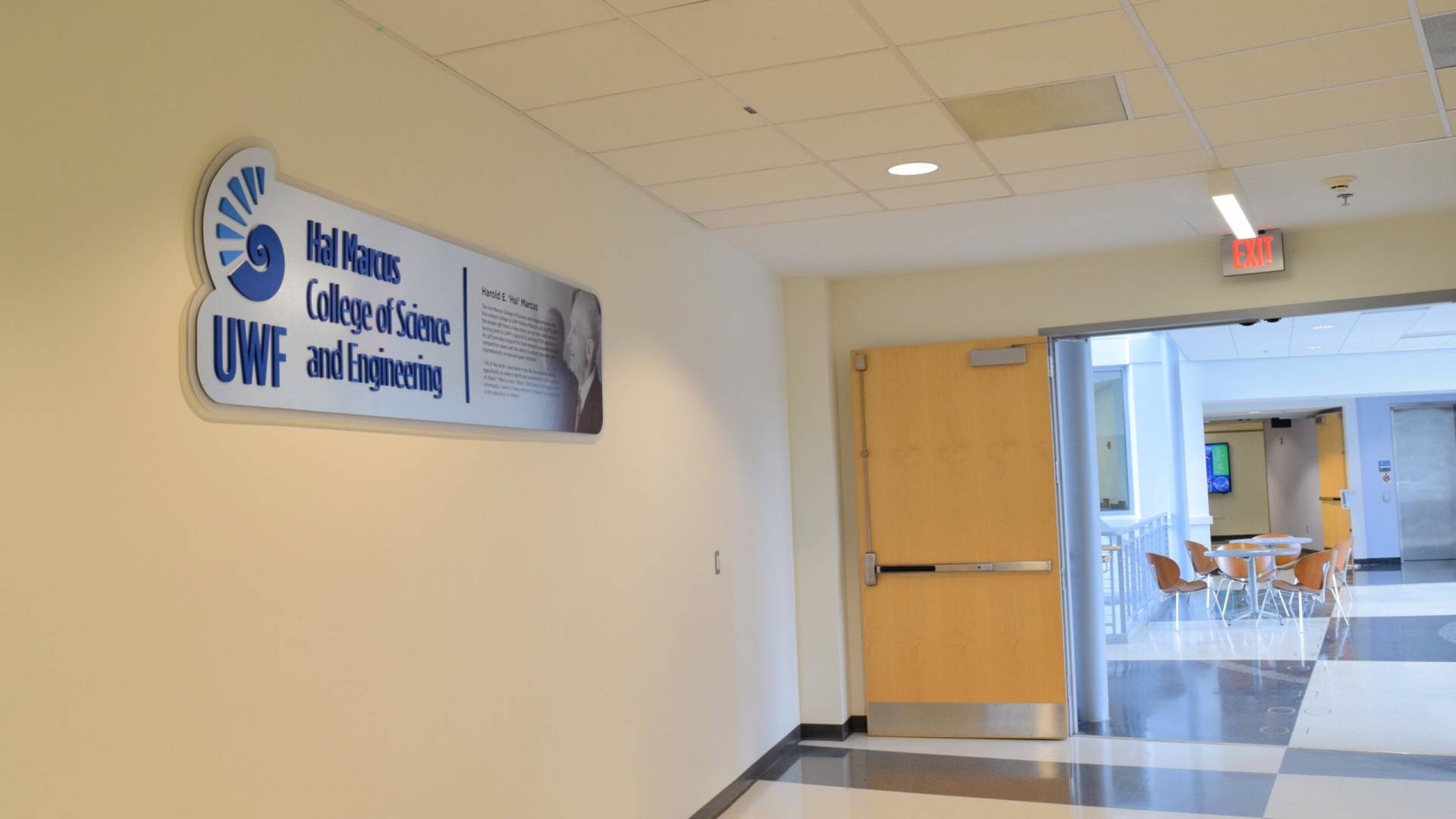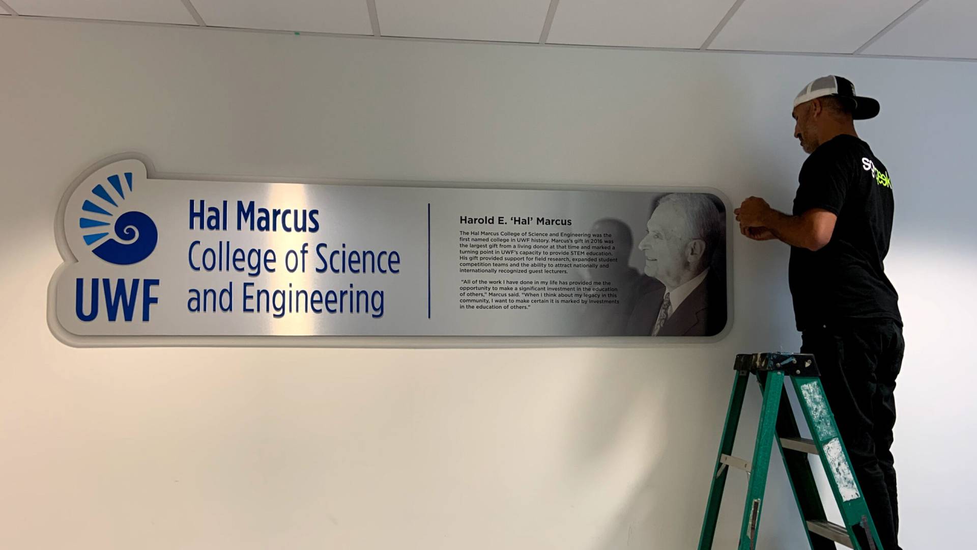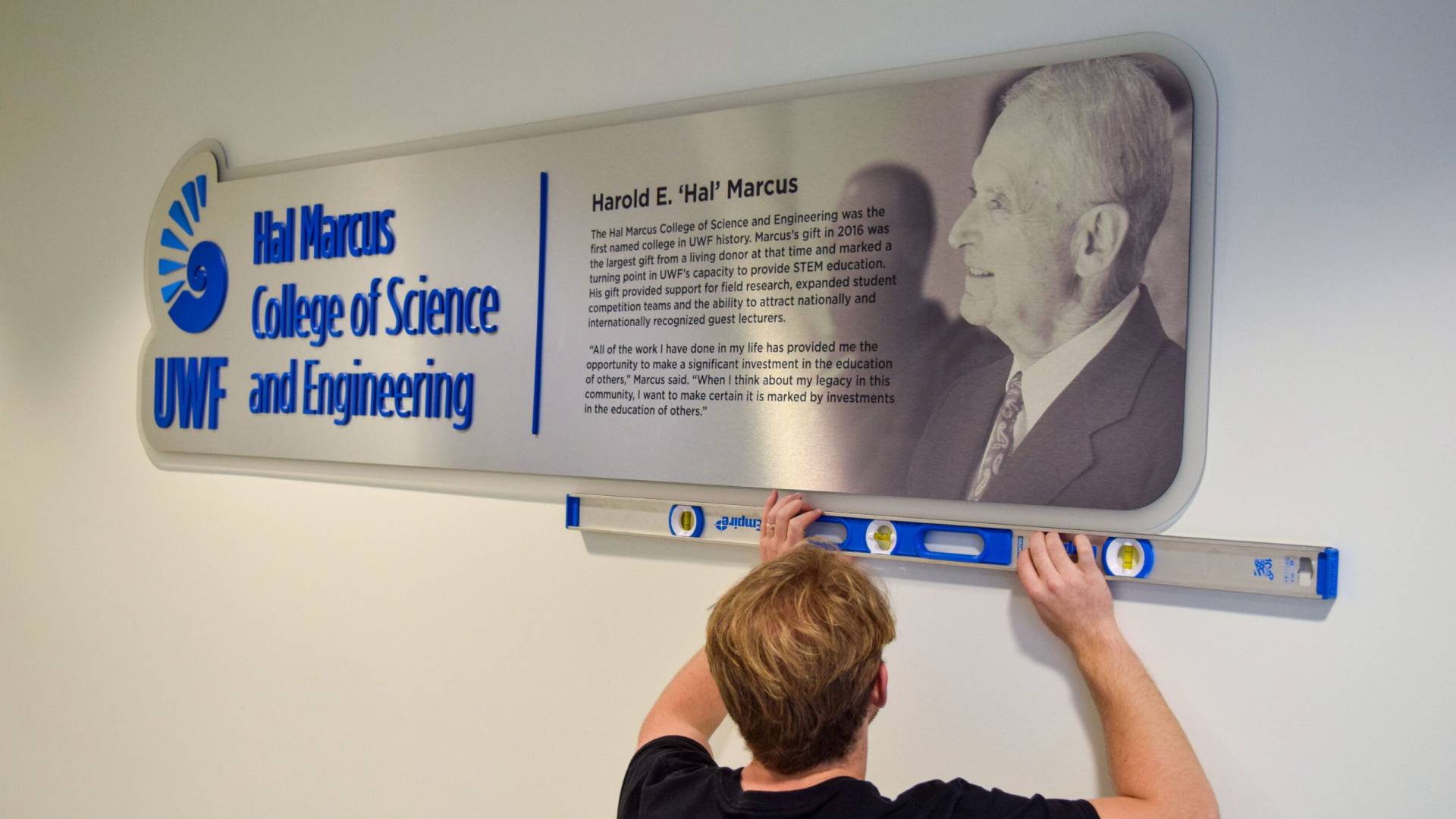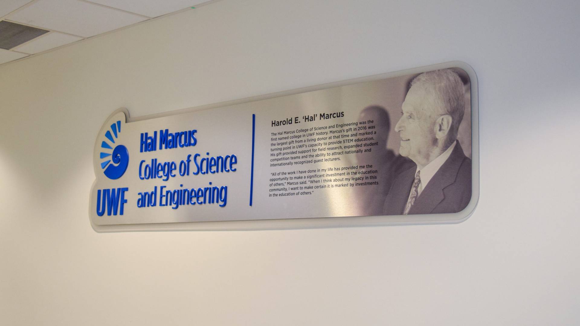 The University of West Florida requested a contemporary, unique donor display to honor Hal Marcus that aligned with the college’s interior aesthetics and brand design guidelines. The donor sign was created by directly printing a custom grayscale image onto brushed aluminum laminate, which we then sealed with a protective coating for durability. Using our laser cutter, the team produced dimensional acrylic lettering and logos for application to the panel.