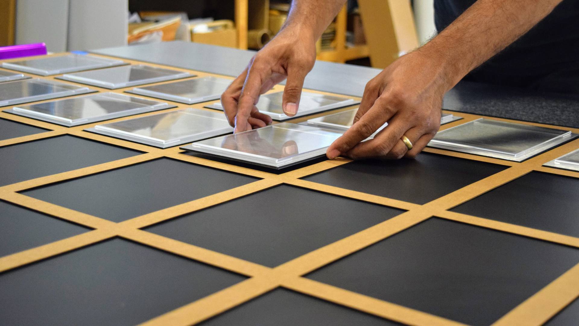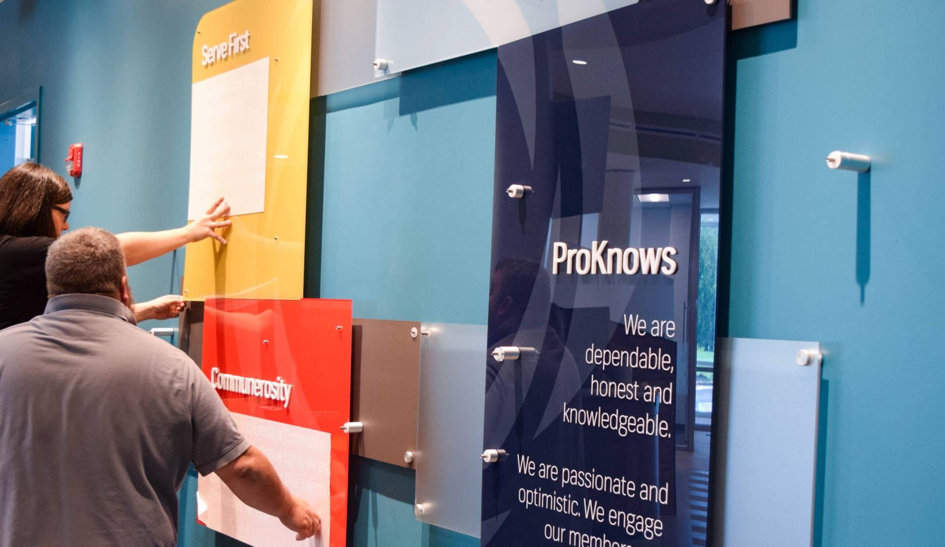 We started by second-surface printing each graphic. Our technicians used Visual Magnetic’s Invisilok system, allowing us to easily print replacement changeouts for the testimonial sections. These particular changeouts won’t require us to take apart the display during future changes. Invisilok’s system allows for three different areas of information and testimonials to be changed out by customers with ease. Additionally, our craftsmen laser cut acrylic letters for the dimensional lettering. This lettering functions as a headline, exhibiting each company value along with a brief summary of each value in white vinyl lettering. A laser cut acrylic logo icon and header function as the focal point. Our technicians attached all layers to the wall via aluminum standoffs and caps.