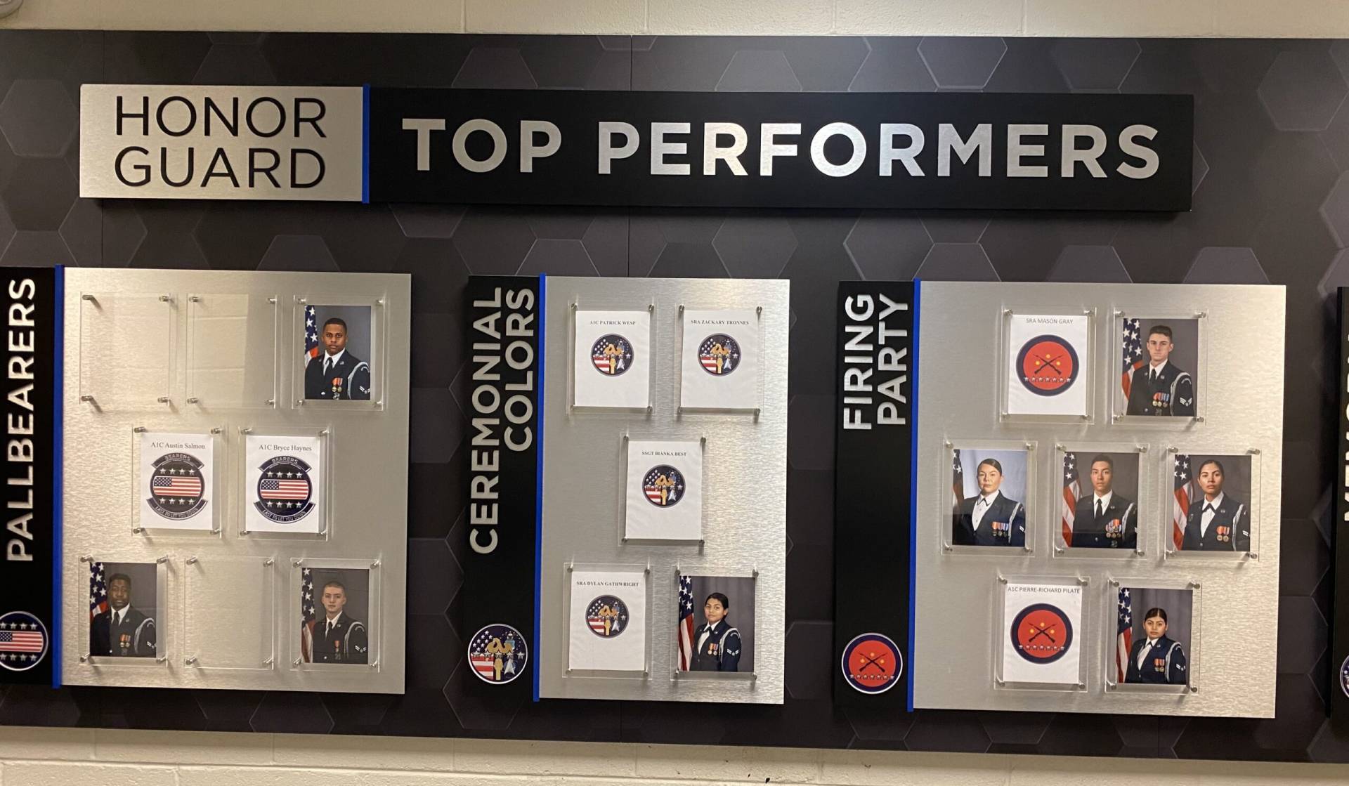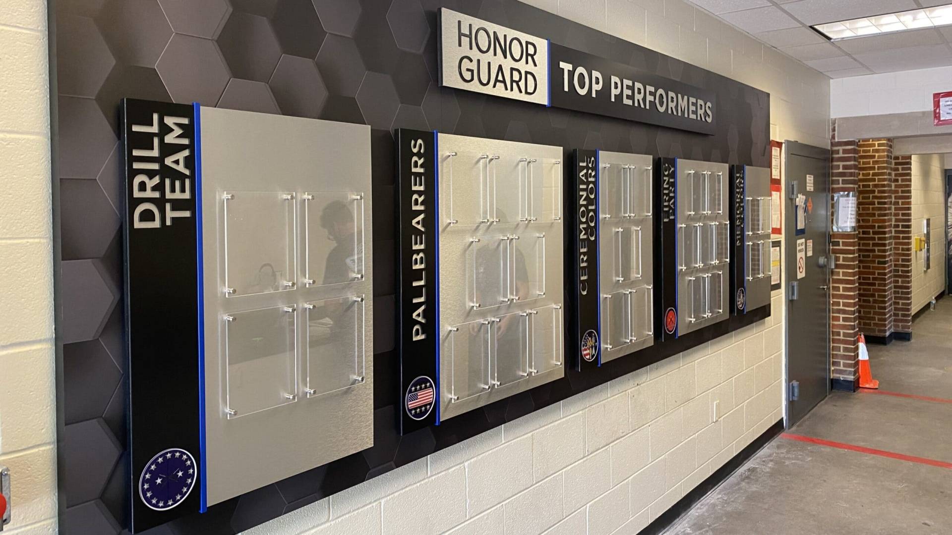 Joint Base Anacostia–Bolling enlisted signgeek to help recognize their top-performing Honor Guard members. We designed and built a custom multilayer photo-wall display for the Washington, D.C., military base, with each team display board constructed from PVC and finished with a brushed aluminum laminate. The corresponding team logos are second-surface printed on clear acrylic and mounted to a custom acrylic sidebar featuring knock-out lettering that reveals the brushed aluminum beneath the team titles. For the painted elements, our in-house painter coated all components using signgeek’s high-quality Matthews Paint System. To elevate the presentation of the portraits, we selected photo holders made of clear acrylic mounted on aluminum standoffs.