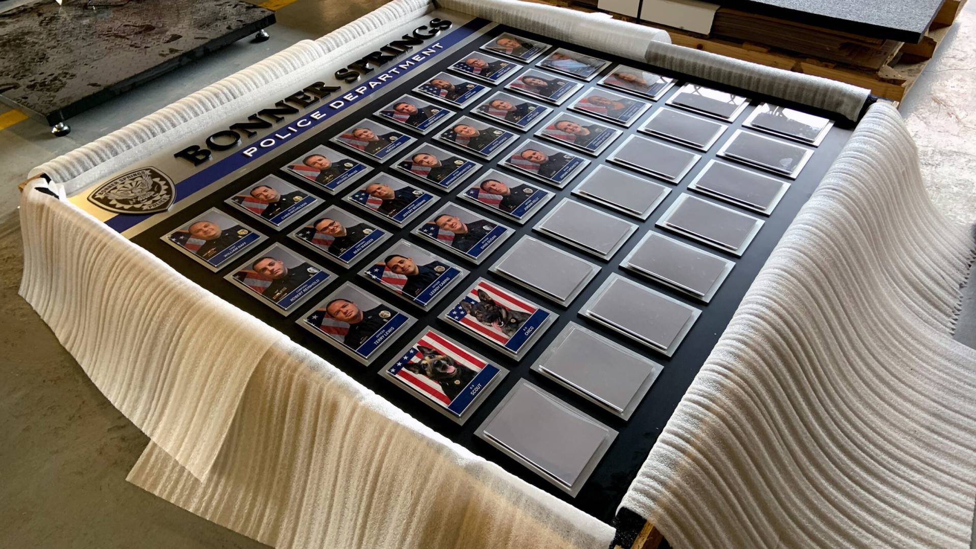 The recognition wall includes 40 easily changeable 5″ x 7″ photo frames, allowing for seamless updates as new team members join. Once complete, the display was carefully packaged and shipped to the department for installation. The finished product provides Bonner Springs Police Department with a striking office centerpiece that celebrates staff achievements, supports future growth, and reinforces their brand identity.