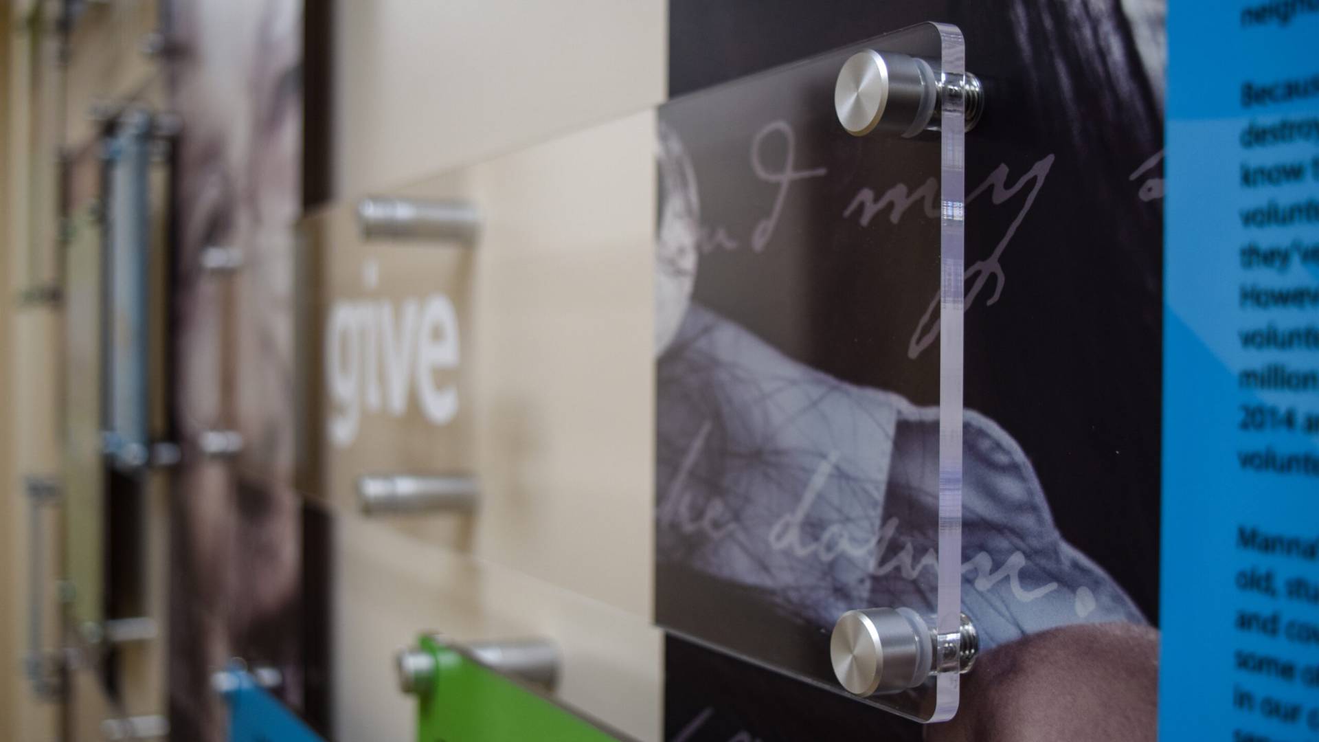 The solution was a fully custom, multi-layered acrylic donor wall, designed and built in-house by signgeek. All lettering and components were precision laser-cut from quarter-inch clear acrylic. Matte and gloss first-surface overlays were applied to create visual contrast and depth. Photographic panels representing Manna’s clientele were finished with a matte overlay, while the donor and history panels received a high-gloss finish and were painted to align with Manna’s updated brand colors. Color accuracy was achieved using our Matthews Paint mixing system to ensure consistency across every element.
