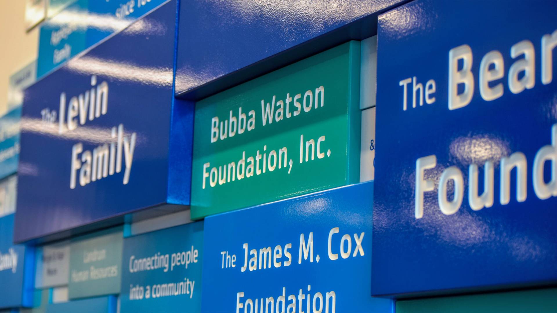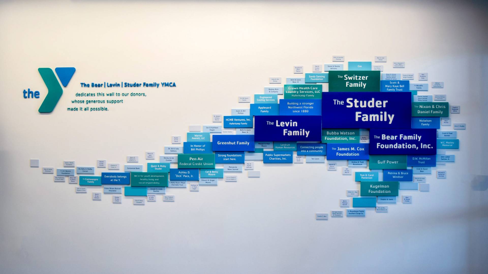 We helped the YMCA find their way by crafting all multilayer wayfinding signs. They were painted in-house using our Matthew’s Paint custom mixing station. Owning our own mixing station equips us with a potential to precisely match the brand’s identity colors. Using our digital plotter, the signs were created with PVC along with applied vinyl lettering. Our crafters cut each piece of PVC to the specifications needed by use of our own CNC Routing table. Furthermore, our experienced technicians also assembled and installed the new signage. If you were to visit the Aquatic or Health and Wellness Centers, you’d notice larger donor recognition room signs paired with each of the vast spaces. We used dimensional cut and painted PVC lettering for the typography method here – adding a unique twist to the wayfinding signage.
